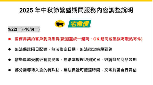 黑貓宅急便~中秋繁盛期間宅配物流量激增,9/22~10/6恕無法指定到貨日期及時段,敬請見諒。
